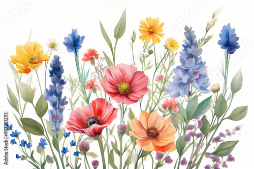 Watercolor illustration of a bouquet of wildflowers, featuring a mix of colorful blooms and greenery, Generative AI