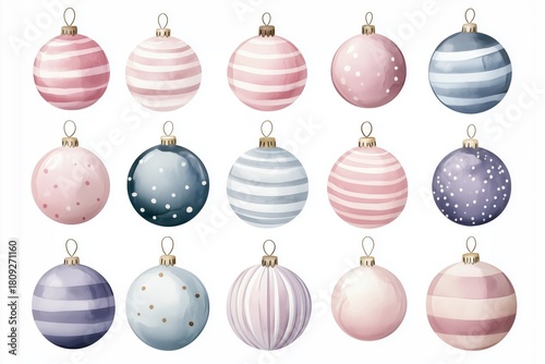 Watercolor illustration of a mixed set of decorative baubles featuring striped, dotted, and standard designs, perfect for holiday decor and festive celebrations with copy space