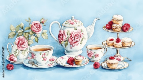 Watercolor illustration of British afternoon tea,tea break in the English style,tea set with Afternoon tea stand with macaroons and scone,cake,cup of tea,Tea time dessert table,vintage style.
