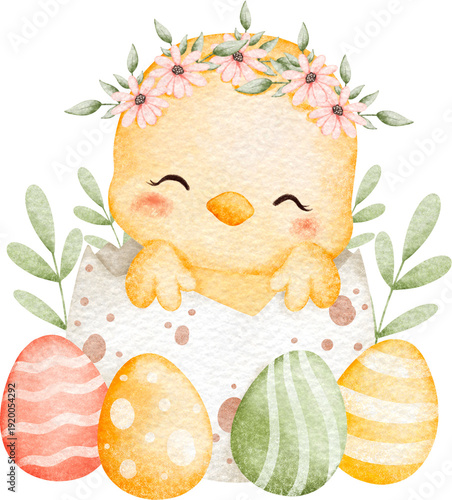watercolor, easter, animal, chick, chicken, bird, holiday, egg, easter egg, garden, flower, spring, nature, clip art, cute, cartoon, decoration, illustration, hand-drawn