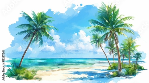 holiday, summer, vacation, watercolor, illustration, palm tree, beach, ocean, sea, travel, design, logotype, t-shirt, isolated, white background, tropical, vibrant, palm, summer getaway, artistic, hi-res, nature, graphic design, resort, coastal, tree, island, sand, sky, water, paradise, landscape, coast, caribbean, coconut, sun, seascape, cloud, relax