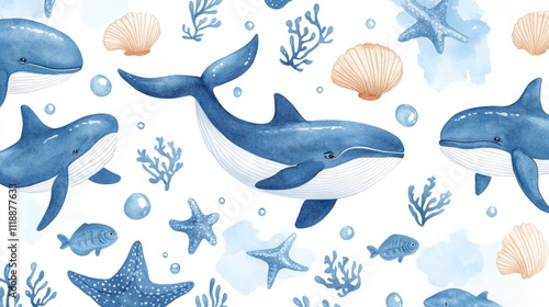 whale, dolphin, seahorse, shell, fish, coral, marin, life, underwater, pattern, seascape