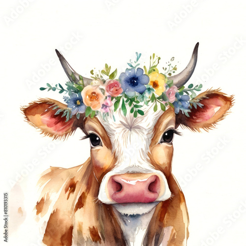 watercolor, farm, illustration, cow, animal, milk, dairy, nature, cute, funny, agriculture, calf, brown, design, art, card, mammal, domestic, face, portrait, cartoon, flower, pet, farm animal, silhouette, standing, bull, fashion, fun, rural, countryside, adorable, poster, print, clip art, chaplet, decor, flower, floral, childlike, pretty, touching, painting, painted, blossom