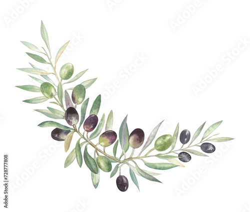Watercolor illustration of the olives and leaves. Elegant arrangement for invitations, packaging, dishes and greeting cards