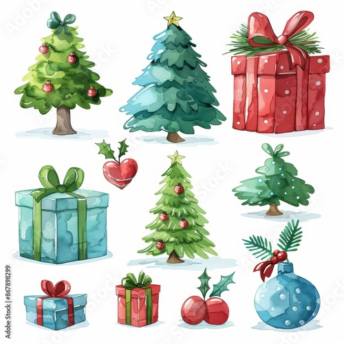 watercolor, tree, christmas, gift, box, illustration, decorated, bow, ornament, honed, festive, colourful, holiday, design, decoration, white background, seasonal, celebration, joyful, greenery, nature, traditional, holiday spirit, artistic, detailed, creative, festive season, winter holiday, new year, bright, cosy, cheerful, whimsical, winter landscape, shiny, vibrant, elegant, decor, christmas tree, decorative, red, blue, green, set, isolated, background, collection