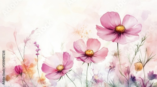 cosmos, garden, watercolor, pink, field, background, autumn, landscape, frame, vector, isolated, nature, floral, beauty, white background, leaf, plant, environment, beautiful, hand-drawn, decoration, flora, blooming, pink flower, korea, korean, seoul, japan, japanese, bloom, decoration, flower, summer, illustration, leaf, white, colours, natural, botany, bouquet, flower petals