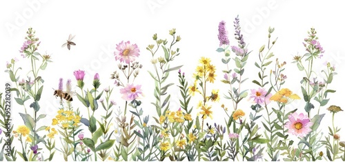flower, meadow, watercolor, wildflower, floral, art, nature, painting, illustration, design, bee, insect, green, pink, yellow, white, summer, garden, bloom, plant, botanical, beautiful, colourful, delicate, fragile, fresh, vibrant, rustic, organic, field, grass, stem, leaf, artwork, landscape, artistic, natural, high-coloured
