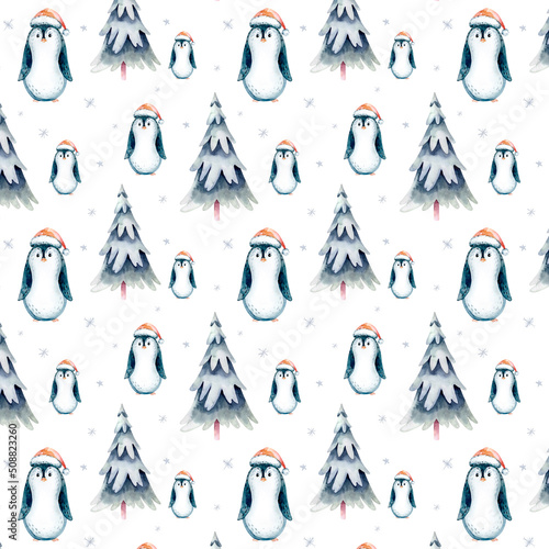 Watercolor Merry Christmas seamless pattern with snowman, christmas tree , snowman, holiday cute animals bunny rabbit, rabbit and baby deer . Christmas celebration cards. Winter new year