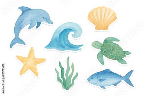 Watercolor ocean animal sticker set with dolphin, sea turtle, fish, starfish, shell, seaweed, and wave illustrations
