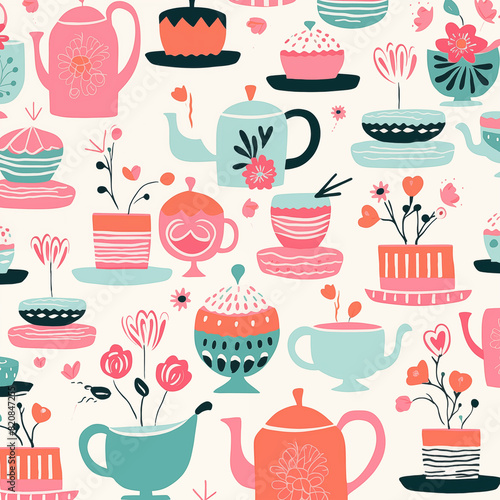 cake, tea, food, cupcake, hot drink, cup, pattern, set, illustration, icon, sweet, dessert, drink, design, kitchen, chocolate, cute, candy, teapot, birthday, cafes, vintage, cream