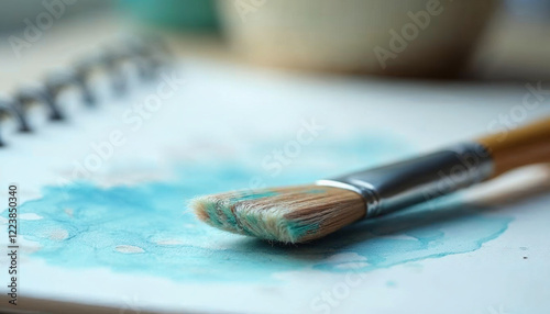 Watercolor Painting Brush and Teal Paint on Paper