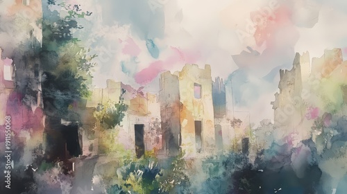 watercolor, castle, ruin, architecture, ancient, history, building, abandoned, dilapidated, stone, nature, overgrown, foliage, tree, greenery, garden, abstract, impressionistic, art, painting, historical, structure, crumbling, wall, landscape, soft, pastel, colourful, aethereal, moody