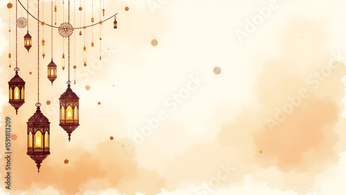Watercolor painting depicting serene Muharram background with soft brushstrokes of lantern silhouettes calligraphic accents and subtle geometric motifs on parchment textured canvas in Photo Stock Co
