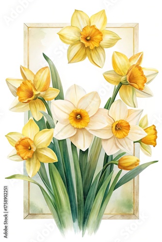 Watercolor painting of a bouquet of daffodils with a golden frame backdrop