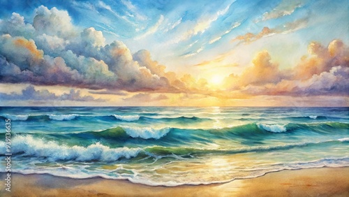 Watercolor painting of a serene seascape with rolling waves under a cloudy sky