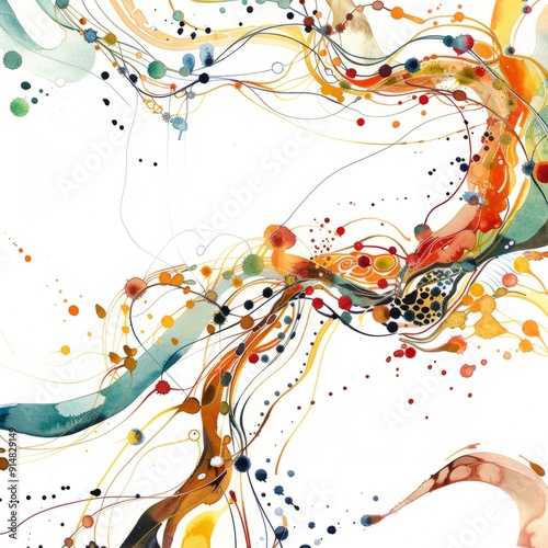 watercolor painting of abstract blobs and lines creating an intricate design, on isolated white background