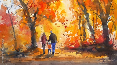 Watercolor painting of parents with a child walking in autumn forest. Concept of family, mother, father, kid, fall season, nature walk, bonding, and outdoor activities