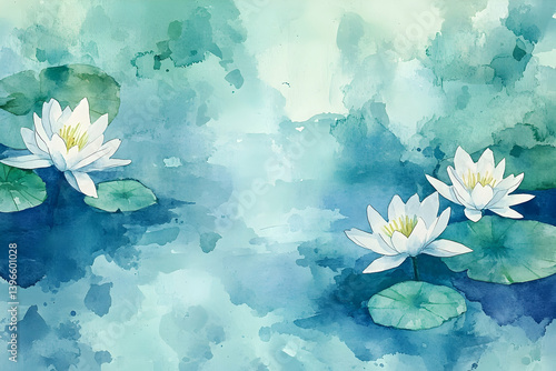 water lily, watercolor, teal, duck pond, flower, aquatic, serenity, peace, nature, beauty, calmness, delicate, blossom, lily, floral, art, painting, still life, illustration, botanical, design, serene, still, water, colourful, gentle, soft, calm, artistic, white, green, leaf, yellow, stamen, vibrant, impressionistic, peaceful, lotus, japanese, oriental