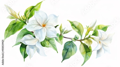 flower, white, leaf, green, watercolor, painting, floral, botanical, art, illustration, nature, plant, bloom, blossom, tree branch, stem, elegant, delicate, beauty, fresh, spring, summer, artwork, design, image, picture, graphic, artistic, visual, creative, aesthetic, vibrant, serene, tranquil, peaceful, soft, gentle, pure, greenery