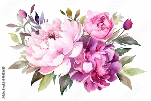 Watercolor pink magenta peony flowers bouquet. Generative Ai