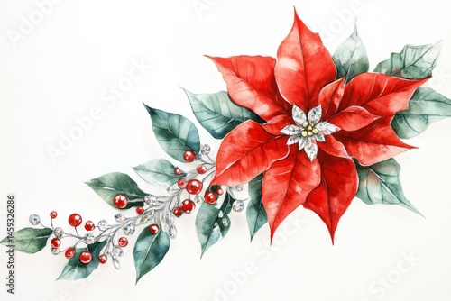 Watercolor poinsettia illustration with embellishments. Detailed poinsettia flower, lush green leaves, and delicate berry clusters. Sparkling accents