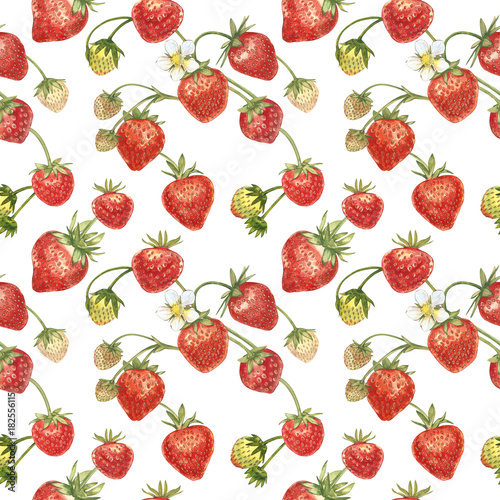 Watercolor seamless pattern with Strawberry leaves with flowers and ripe berries on white. Background design for natural cosmetics