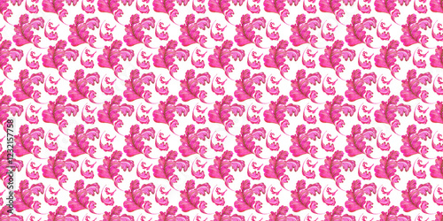 Watercolor seamless pattern with stylized pink and gold abstract acanthus leaves
