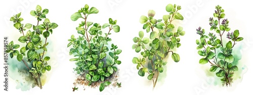Watercolor set collection with green majoram sprig and leaves isolated on a white background. Healthy food and seasoning. AI generated illustration.