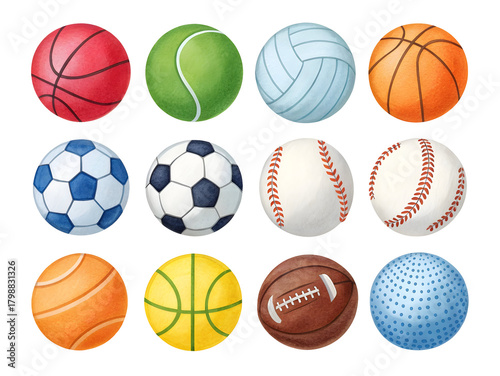 basketball, football, tennis ball, baseball, volleyball, football, sport, game, equipment, round, collection, illustration, watercolor, red, green, blue, orange, yellow, brown, white, pattern, texture, graphic, art, drawing, sport, ball