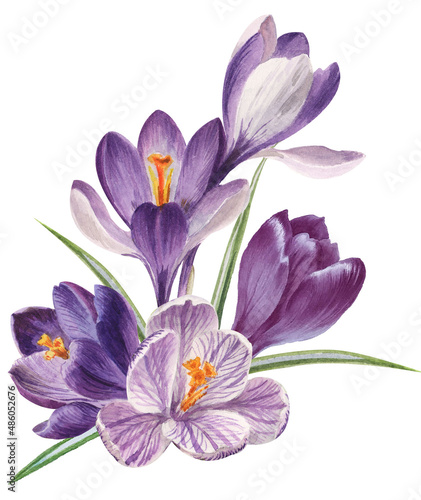 Watercolor spring flowers: violet, blue and white crocuses, botanical illustration