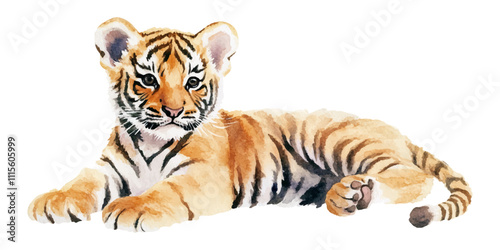 Watercolor tiger cub lying down, clip art on a white background.
