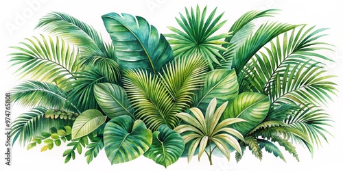 Watercolor Tropical Leaf Arrangement - Lush Greenery, Watercolor Painting, Botanical Illustration, Green Tones, Palm Leaves, Jungle, Exotic