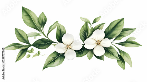 Watercolor white flowers and green leaves arrangement, perfect for wedding invitations or website design