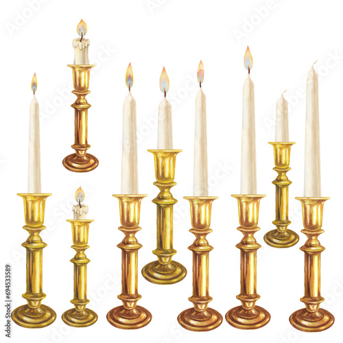 Watercolor white vertical short and long candles with flame in gold and brass candlesticks for Christmas, Candlemas, wedding, birthday, Easter, magic, memorial day, spa and relaxion