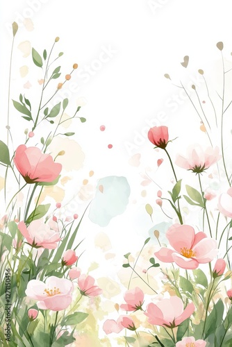 Watercolor Wildflower Meadow, Delicate Pink Floral Background, Dreamy Peaceful Nature Illustration
