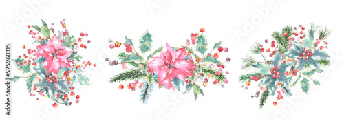 Watercolor Woodland Christmas floral bouquet set illustration. Winter forest flower decoration for greeting card, poster, invitation, baby shower,Merry Christmas, New Year, holiday, sticker, frame