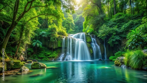 waterfall in forest with lush greenery surrounding it, greenery, serene waterfall