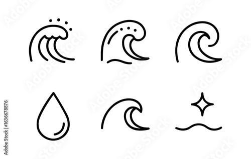 vector, outline, icon, crashing, wave, foam, crest, white horse, line, spray, arc, curl, tip, water, droplet, trough, sun, sparking