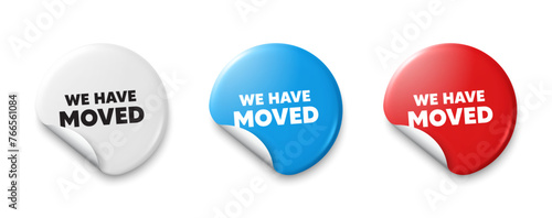 We have moved. Price tag sticker with offer message. Move new address sign. Place relocate symbol. Sticker tag banners. Discount label badge. Vector