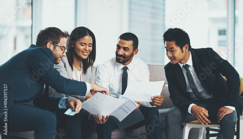 We think wiser when were together. Shot of a group of businesspeople discussing paperwork while sitting together.