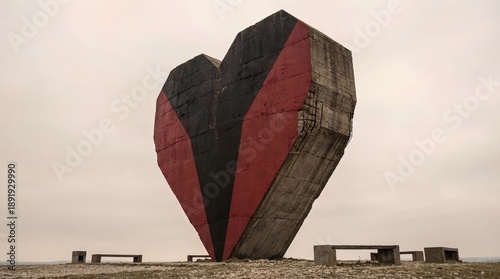 Weathered Concrete Heart Monument with Red and Black Paint in Brutalist Style