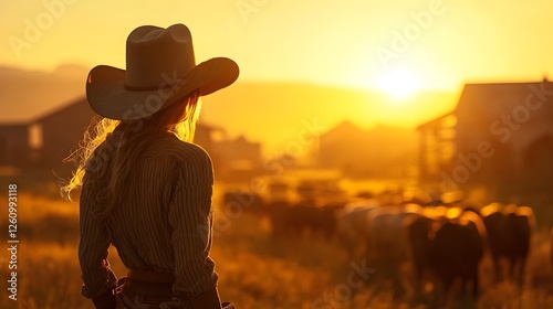 cowgirl, cattle, frontier, town, sunlight, hazy, nostalgic, western, gold, weathered, dilapidated, herding, depth, field, landscape, rural, countryside, nature, sky, horizon, cloud, silhouette, shadow, movement, action, adventure, lifestyle, vintage, retro