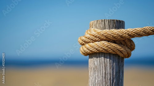 rope, wooden, post, knot, weathered, frayed, beach, nautical, wood, texture, closeup, tied, outdoors, blue, sky, horizon, rustic, natural, maritime, summer, coastal, simplicity, minimalism, ocean, shore, sunny, nature, calmness