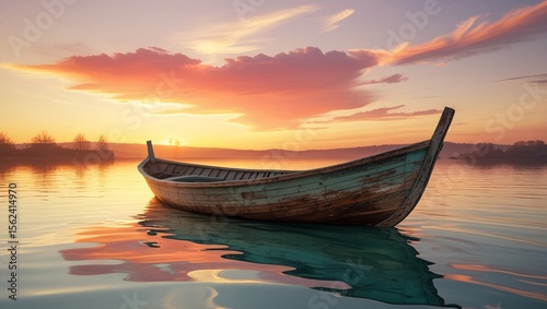 boat, wooden, weathered, water, lake, river, sunset, sunrise, sky, cloud, orange, pink, blue, serene, peaceful, tranquil, landscape, nature, travel, vintage, retro, transportation, nautical
