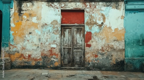 wall, door, wood, wooden, weathered, distressed, building, old, antique, aged, paint, peeling, texture, grunge, rustic, facades, exterior, urban, decay, crumbling, eroded, vintage, history, architecture, background, pattern, colours, teal, blue, red, orange, yellow, brown, grey, stone, concrete, street, city, dilapidated, forgotten, shabby, atmospheric, aesthetic