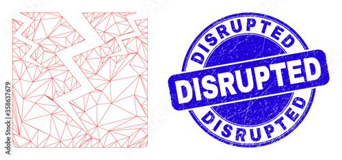 Web mesh crack icon and Disrupted seal. Blue vector rounded grunge watermark with Disrupted message. Abstract frame mesh polygonal model created from crack icon.