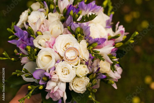 flower, gold, grass, green, holiday, nature, purple, ring, summer, wedding, wedding bouquet, wedding band, white