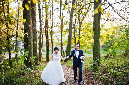 Wedding couple at yellow wood