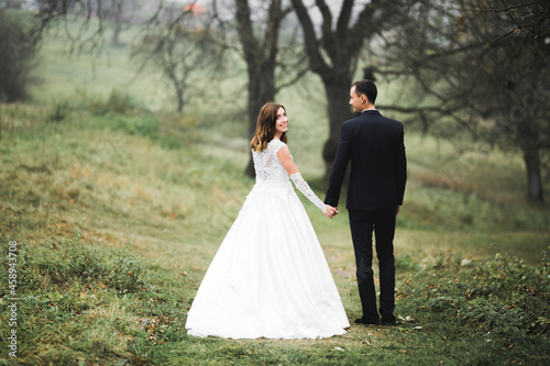 Wedding couple holding hands, groom and bride together on wedding day