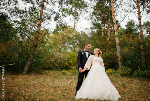 Wedding couple in love at autumn pine wood.